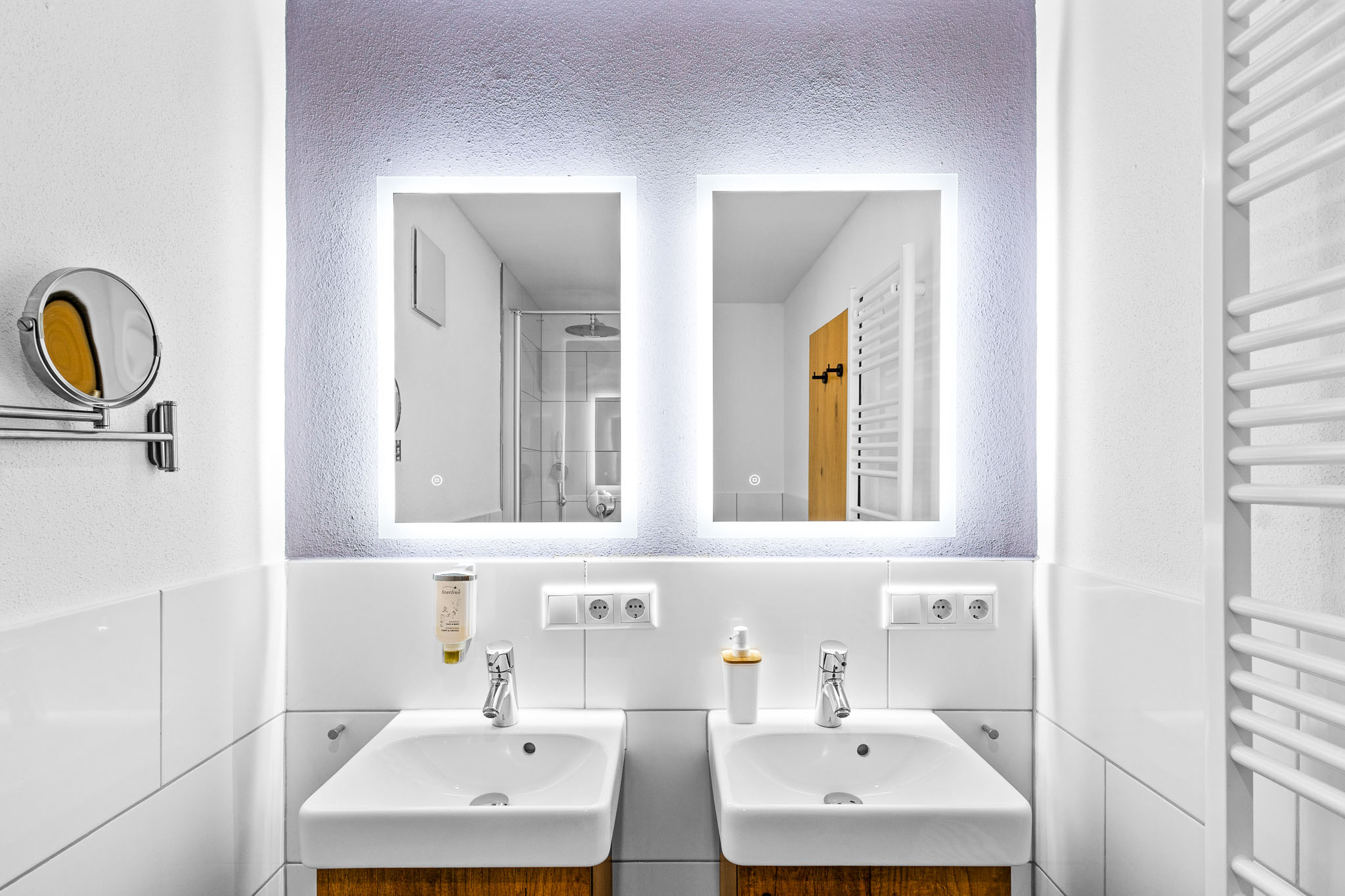 Das moderne Badezimmer ist mit einer Dusche mit Regenwaldfunktion, einem WC sowie beleuchteten Wandspiegel ausgestattet.