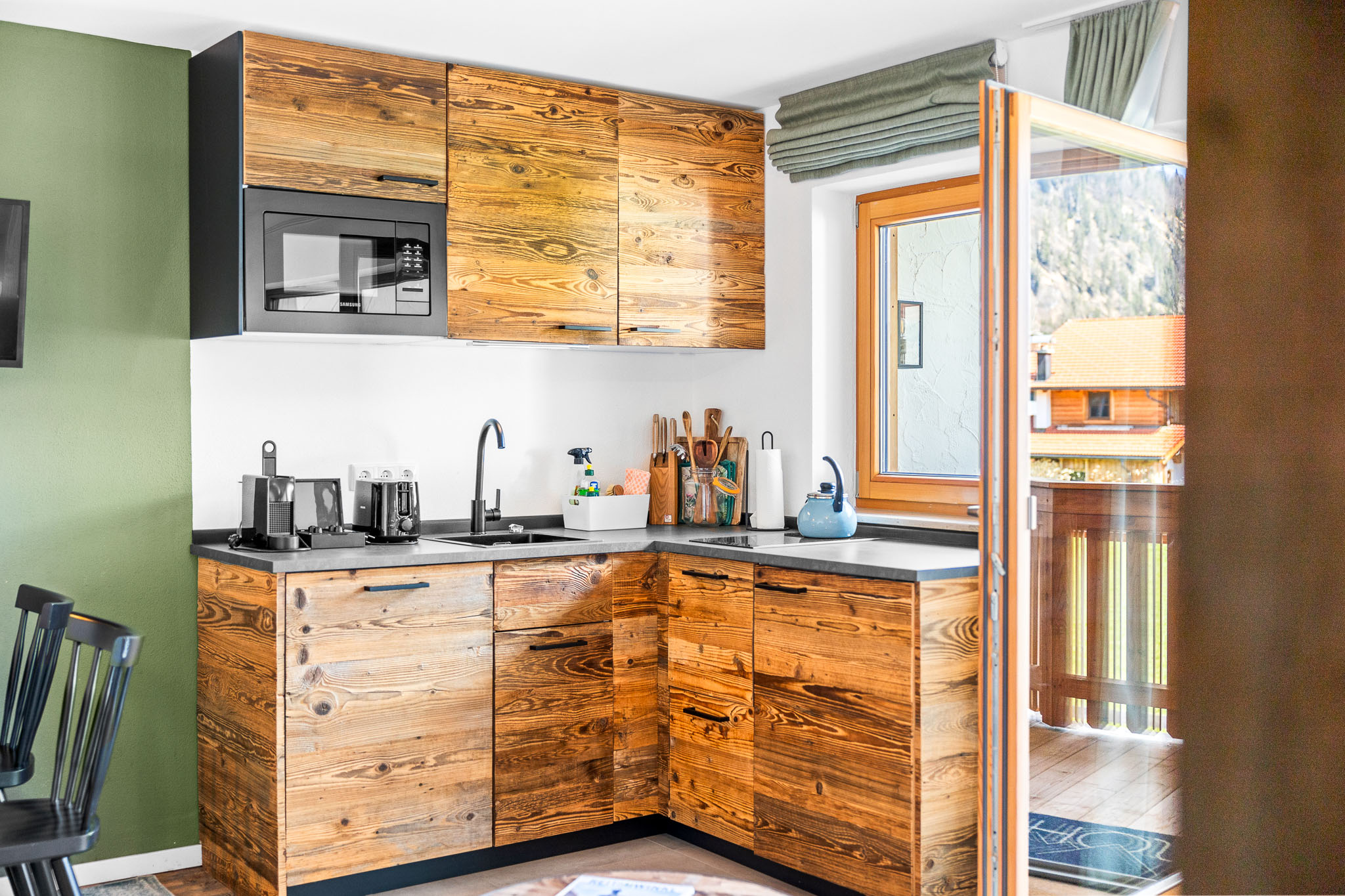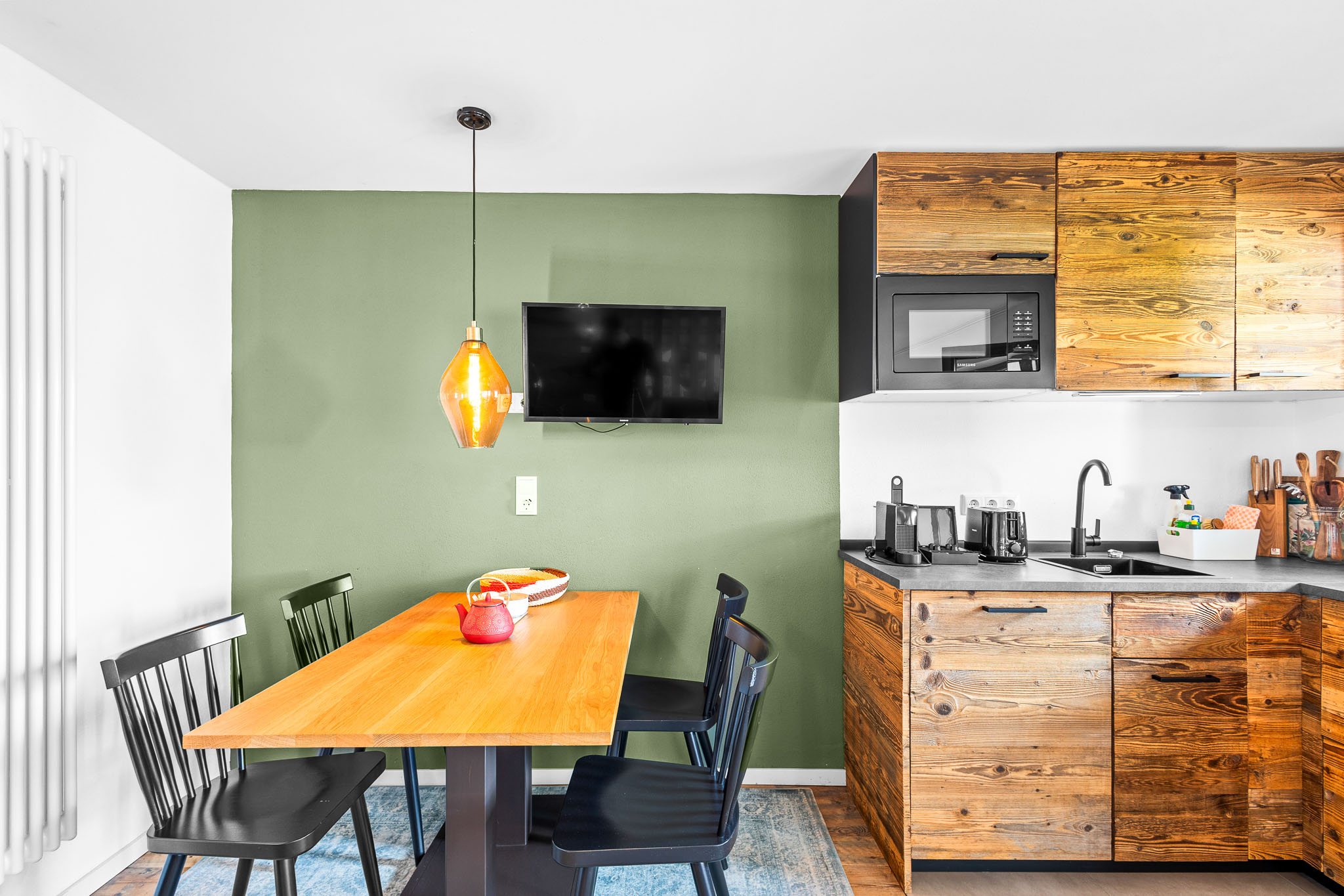 In der voll ausgestatteten Küche gibt es ein Cerankochfeld, Kühlschrank, Mikrowelle, Spülmaschine, Nespresso-Maschine und Wasserkocher.