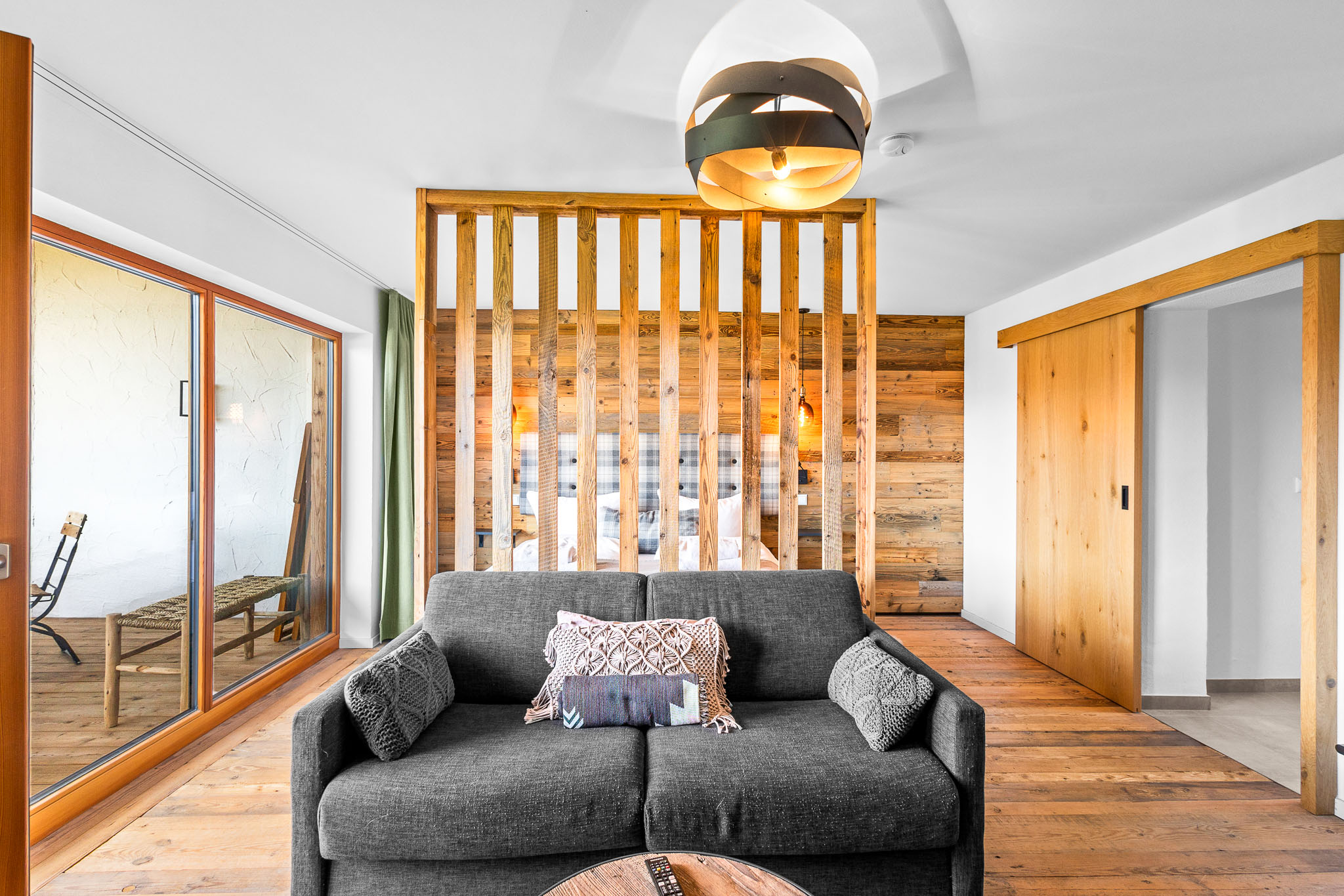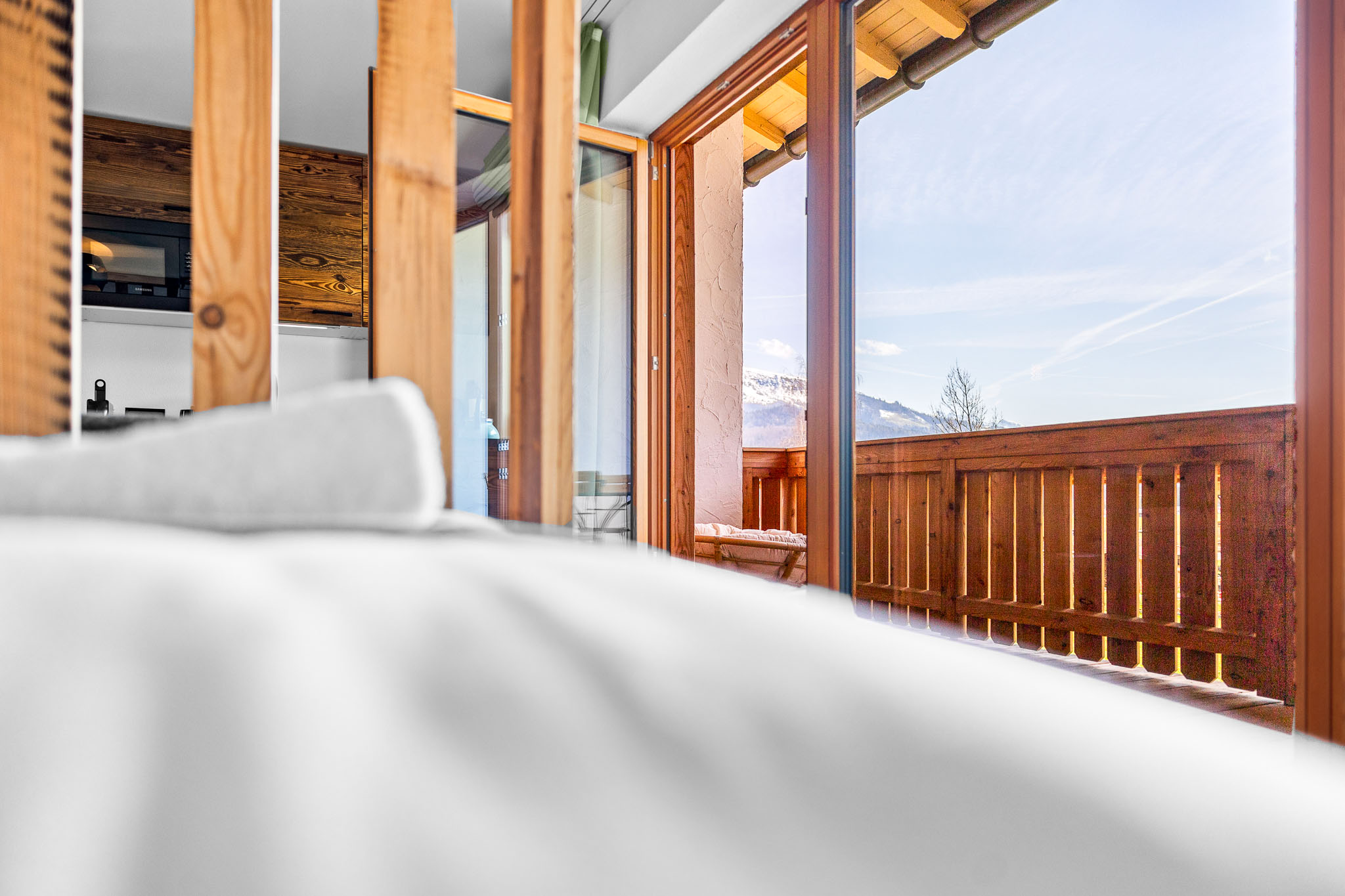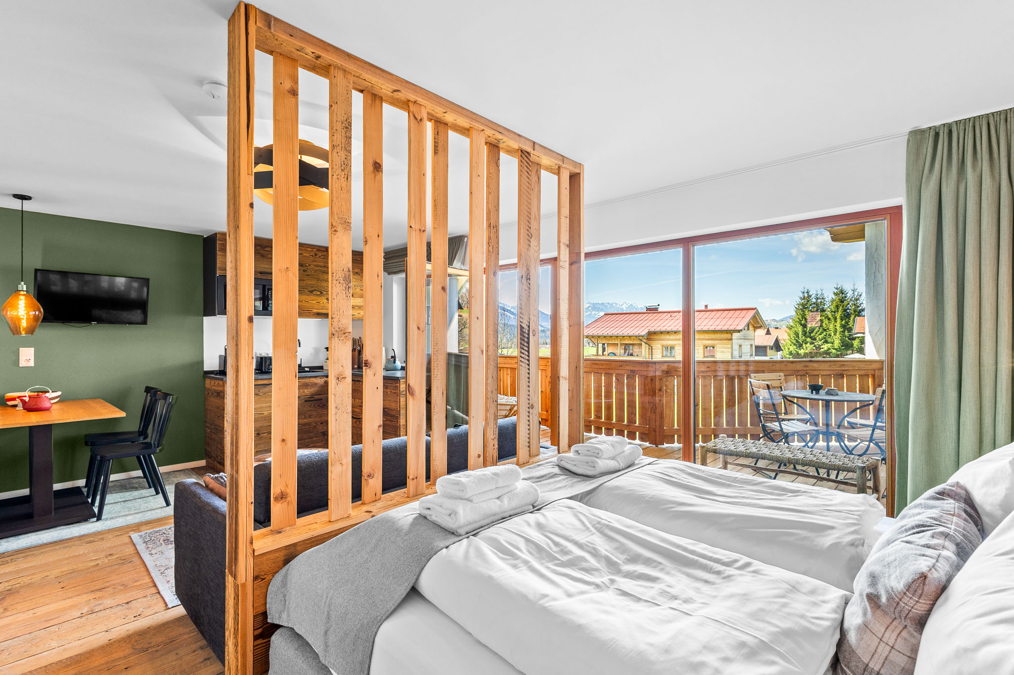 Unser Familien Atelier bietet Platz für bis zu 4 Personen auf 53qm. Ideal für Familien. Genießt den atemberaubenden Blick auf die umliegenden Berge vom eigenen Balkon aus.