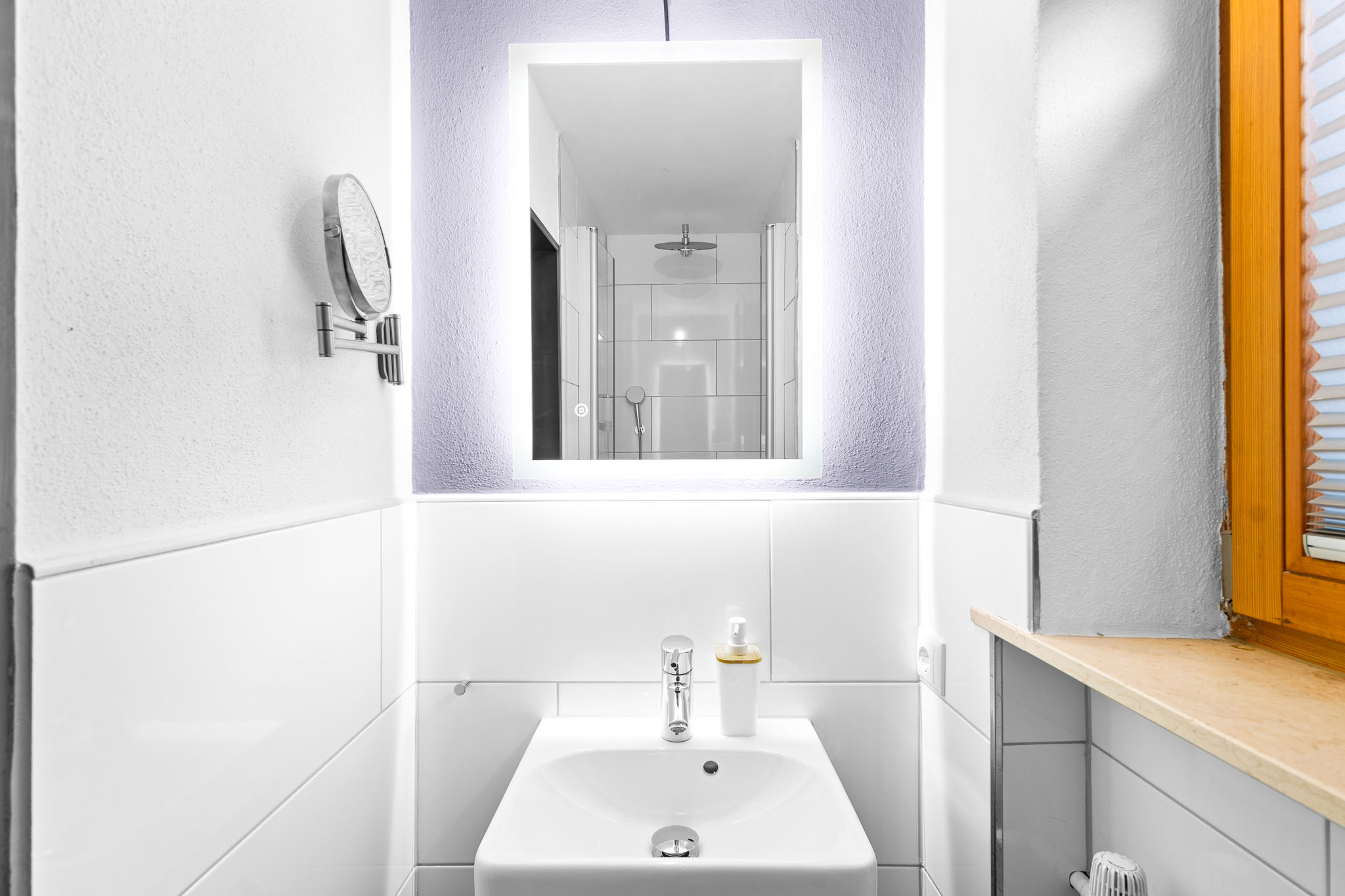 Das moderne Badezimmer ist mit einer Dusche mit Regenwaldfunktion, einem WC sowie Wandspiegel ausgestattet.