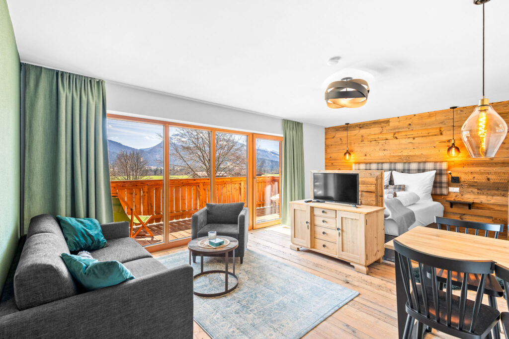 Willkommen in unserem Studio Unterberg in Reit im Winkl! Diese charmante Unterkunft bietet 42 qm Wohnfläche und einen herrlichen Balkon mit Blick auf die Berge. Das Studio ist mit einem King-Size Boxspringbett und einem Sofabett ausgestattet, ideal für Familien.